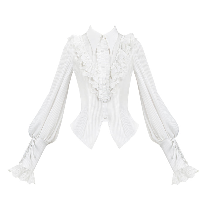 - This delicate Lolita shirt, with its pointed collar and hem, along with long lantern sleeves, stands out with its V-shaped ruffles and delicate frills on the chest, offering a perfect blend of elegance and gothic allure.