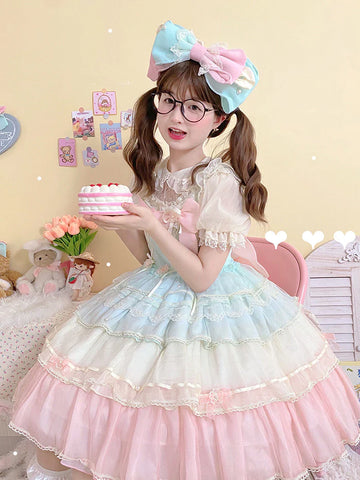 "Robe Lolita JSK à volants arc-en-ciel" par Alice Girl : Il s'agit d'une jolie robe Lolita JSK conçue pour les filles Lolita qui aiment le style Lolita mignon et kawaii. Décoration de rubans croisés, nœuds amovibles et décoration florale. Il y a une fermeture éclair sur le côté et un fronçage dans le dos. Elle est non seulement belle mais aussi agréable à porter !