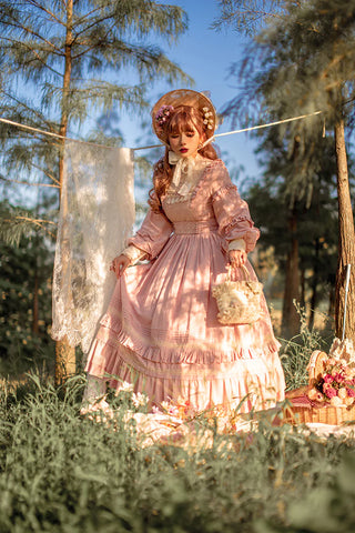 Robe Lolita OP vintage par Alice Girl : Il s'agit d'une élégante robe Lolita vintage une pièce à manches longues. Elle présente des manches longues, un coton jacquard rose de haute qualité et une dentelle délicate. Vraiment élégante et belle.