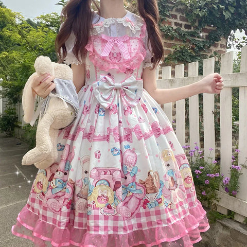 "Sweet Lolita Wreath Bunny Printed Summer JSK" par White Sugar Girl : Ce Lolita JSK doux et kawaii présente un motif imprimé lapin mignon et ludique. Les accents de nœud sur la poitrine et la taille ajoutent une touche de douceur. L'ourlet à volants et le design plissé créent un look fantaisiste. Le dos froncé apporte une excellente expérience de port.