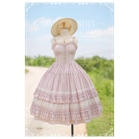 "Elegant Lolita JSK" de Tiny Garden : Cette robe Lolita classique présente une longueur longue, un devant à volants, des lacets des deux côtés de la taille, un dos froncé et un ourlet à volants. Vraiment douce et élégante.