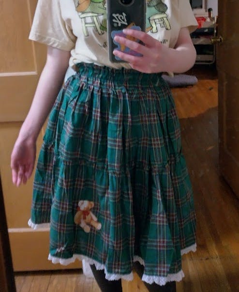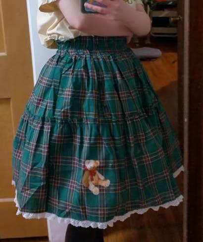 The skirt is beautiful; I love the pattern, and the teddy bear decal and lace around the hem are such nice little extra points of interest that make it really visually appealing; just as much in real life as it was in the pictures! And I think it looks lovely both with and without a petticoat. It has shed several loose threads on my first day of wearing it, but there's no indication that the skirt is poor quality or falling apart, so it doesn't look like that's actually going to be much of a problem - I'm guessing maybe it's just from being straight from the factory?