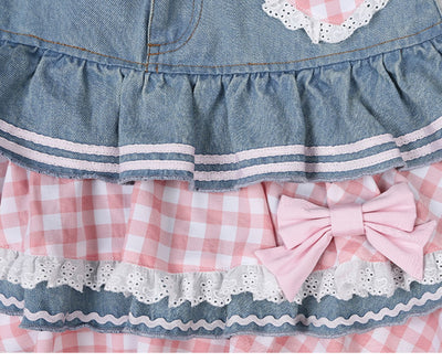 - Light blue and dark blue denim half-skirt with plaid, lace, and bow details.