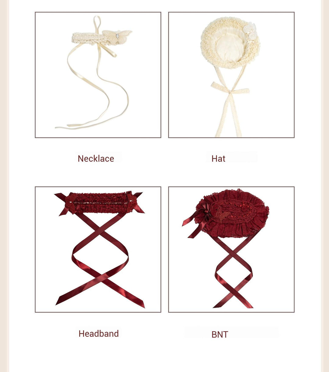- Elevate your Lolita style with the Miss Flora accessory set, featuring an optional chic choker, elegant headband, versatile hat, and stylish BNT.